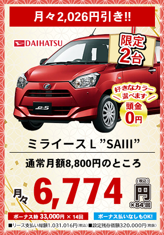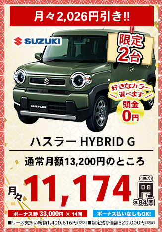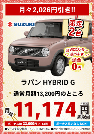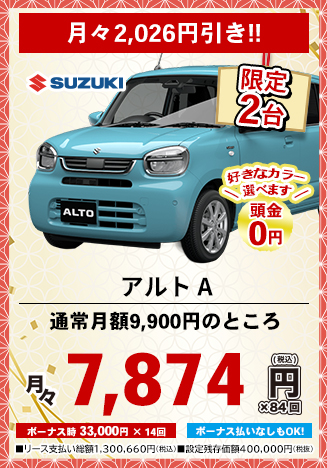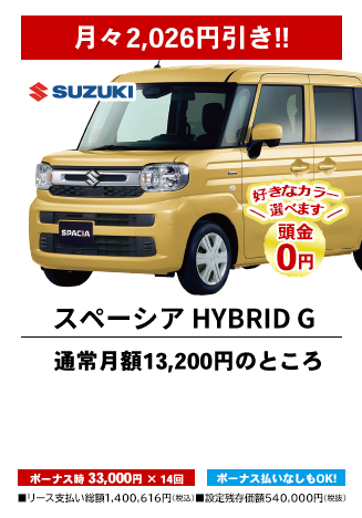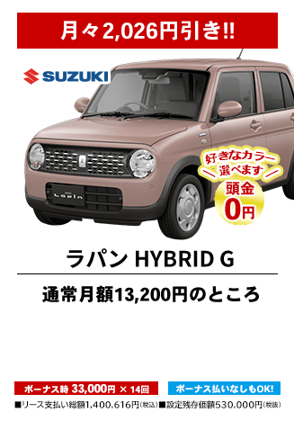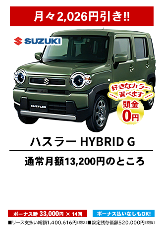 カーリースとは、毎月定額払いで新車に乗れるリースプランです。毎月のお支払い料金はお選びいただく車種や契約期間、ボーナス払いの金額設定、オプション設定などにより設定されます。