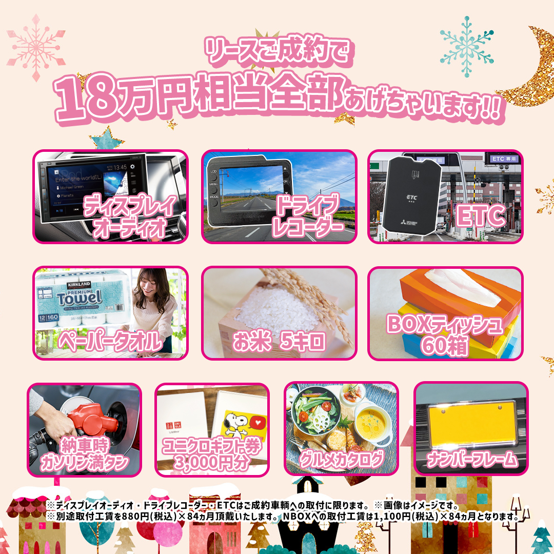 車検費用・自動車税、自賠責保険料、登録諸費用、点検・オイル交換などの費用にロードサービスまで、すべてコミコミで毎月定額です。さらに、メンテナンスやナビなどもセットになったオプションプランもご用意しています。不定期に訪れるまとまった出費の心配なく、安定した定額払いのカーライフをお送りいただけます。